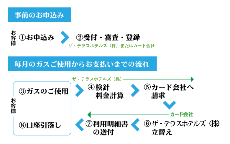 - (株)ザ・テラスホテルズにお客様からお申出がない限り、お申込みいただいたクレジットカードにより、毎月、継続してガス料金等をお支払いいただきます。